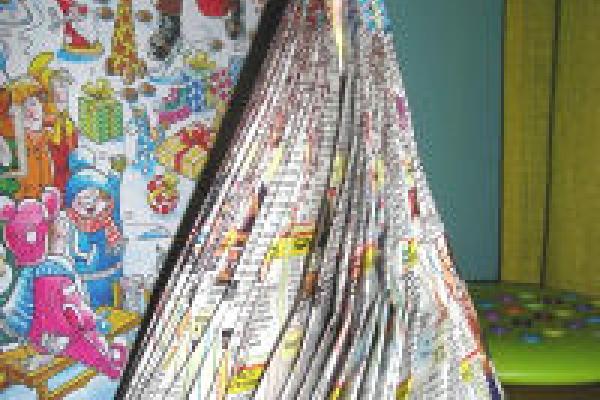 Sempre di Prumiao e Carlotta: Ripiegando le pagine di un vecchio giornalino, decorando con brillantini e una stellina, hanno fatto un albero di Natale ecologico!