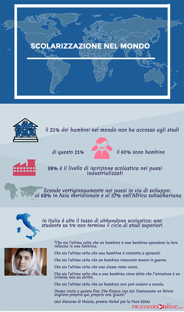 Ad esempio il 21% dei bambini nel mondo non gode del diritto allo studio e, mentre nei paesi industrializzati il tasso di iscrizione scolastica è del 98%, esso scende vertiginosamente nei paesi in via di sviluppo come al 68% in Asia meridionale e al 57% nell' Africa Subsahariana.