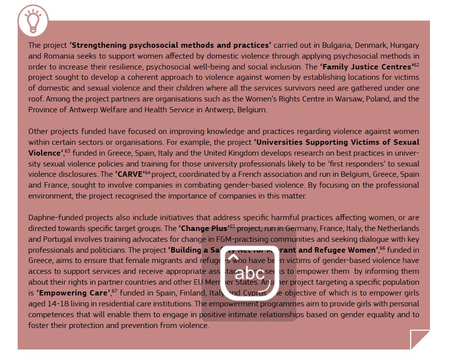 Attraverso l'obiettivo Daphne, incluso nel programma "Rights, Equality and Citizenship", sono stati varati numerosi progetti.